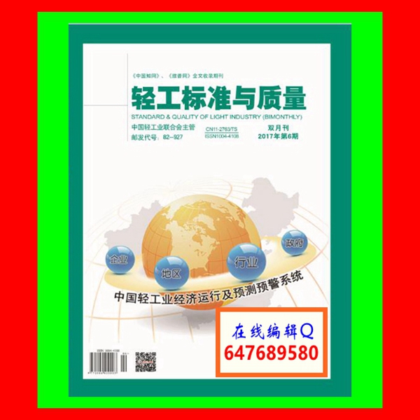 《轻工标准与质量》杂志创刊于1990年,是经国家新闻出版广电总局批准,由中国轻工业联合会主管,中国轻工业信息中心和中国轻工业质量认证中心主办的目前国内唯一以轻工业标准化工作定位的国家级行业专业期刊、综合经济科学类专业期刊(双月刊)。国内刊号:CN 11-2763/TS,国际刊号:ISSN 1004-4108,邮发代号:82-927。本刊主要栏目:政策法规、标准的制度与实施、质量监督、研究与探讨、WTO话题、国外标准信息、大家谈、企业之窗、消费走廊、防伪技术、认证、国标与行标、国内动态等。本刊为《中国核心期刊(遴选)数据库》、《中国期刊全文数据库》、《中文科技期刊数据库》、《中国期刊网》等数据库全文收录期刊。